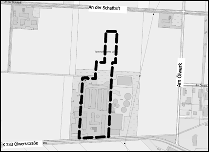 Das Plangebiet liegt an der Ölwerkstraße 96, K233 Gemarkung Dalum, Flur 31, Flurstück 9/2, der Gemeinde Geeste. Der Geltungsbereich ergibt sich aus dem Kartenausschnitt (Quelle: Auszug aus den Geobasisdaten der Niedersächsischen Vermessungs- und Katasterverwaltung © 2026 )