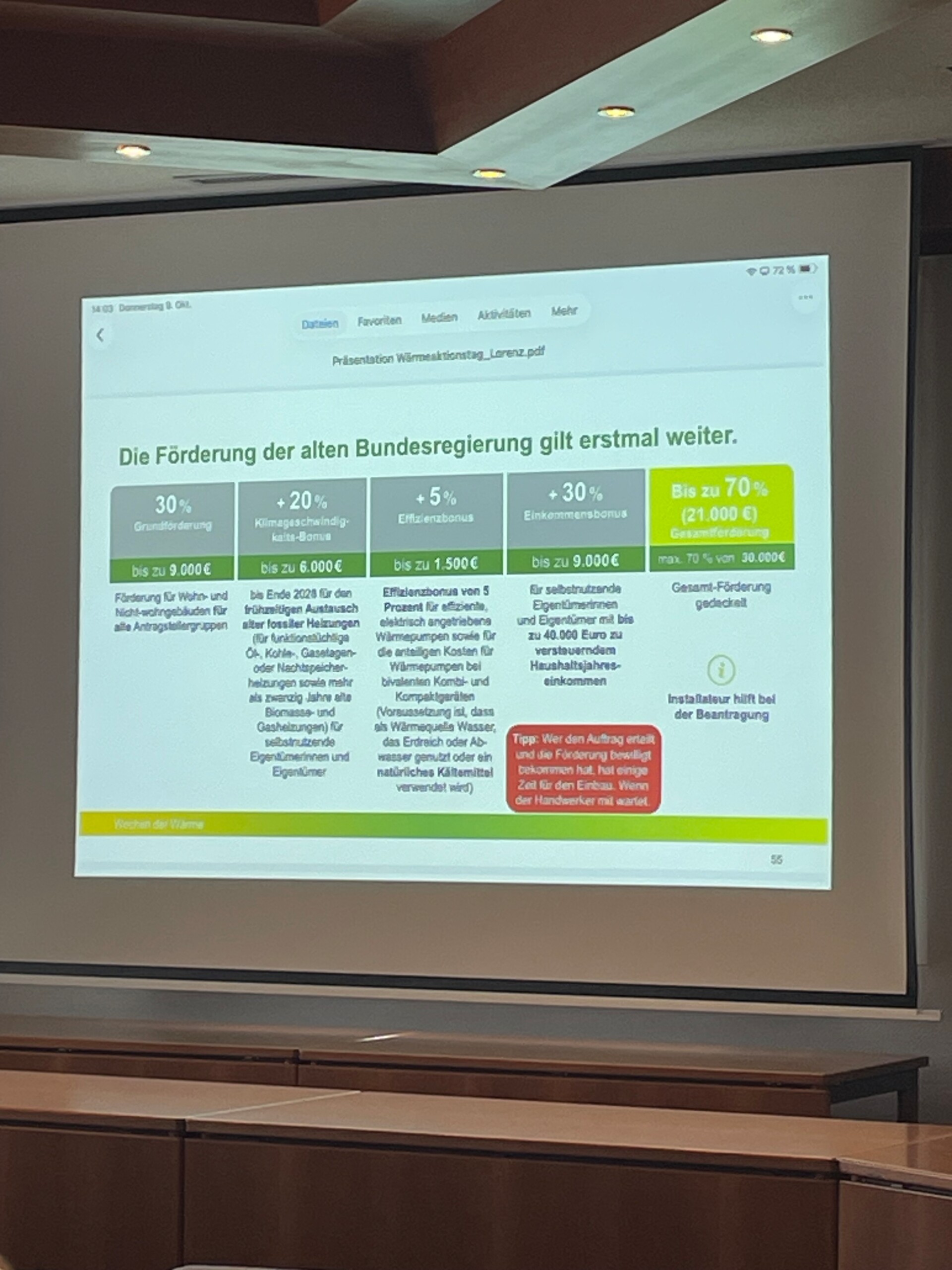 Vier Fachvorträge gaben praxisnahe Einblicke in die Wärmewende: Johannes Lorenz von der Energieeffizienzagentur Meppen erklärte die ersten Schritte und klaren Ziele der Wärmewende, während Christina Penning vom Ingenieurbüro Penning die Förderprogramme des Bundes zum energiesparenden Bauen und Sanieren vorstellte. Laurenz Menke von der Gemeinde Geeste berichtete, wie energieeffizientes Bauen und Sanieren in der Praxis gelingt, und Jens Kawaletz-Dübbel von Brötje Heizung informierte über praxisgerechte Heizsysteme für den Bestandsbau. Krankheitsbedingt entfiel der Vortrag von Schornsteinfeger Klaus Holterhaus. Die Vorträge fanden regen Zulauf, im Schnitt 20 bis 25 Zuhörer verfolgten die Präsentationen.