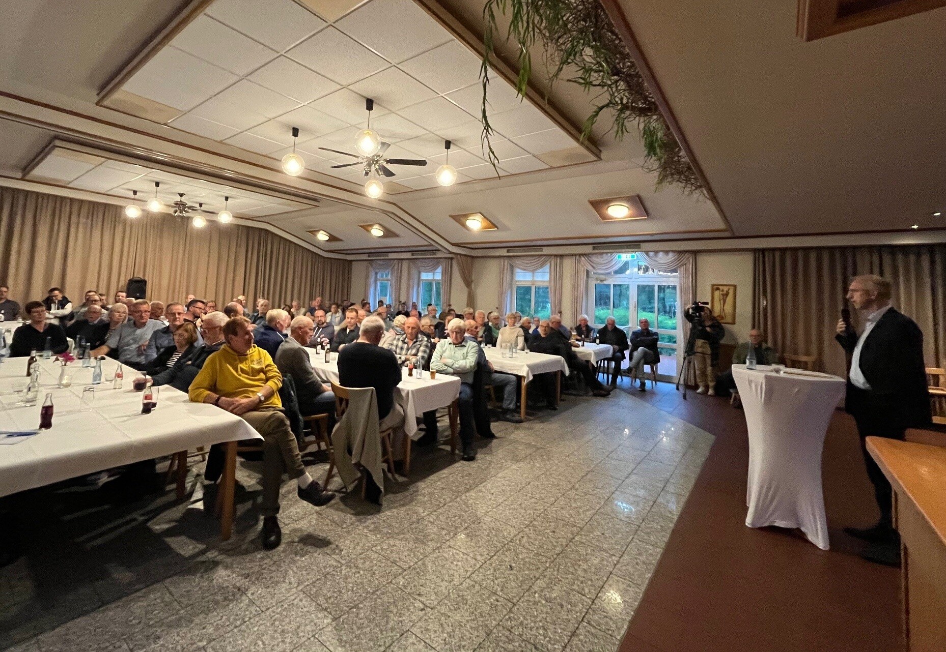 Auf besonderes Interesse stießen die Ausführungen Hökes zum Regionalen Raumordnungsprogamm des Landkreises Emsland für den Bereich „Windenergie“. Dieses Programm weist das an Osterbrock und Bramhar angrenzende Waldgebiet „Engelbertswald“ als Vorranggebiet für Windenergie aus und soll nach dem Willen des Projektierers WPD zeitnah mit 14 Windenergieanlage bebaut werden. Kritische Fragen u.a. zu Abständen, Schattenschlag und Geräuschemissionen, aber auch zu Kompensation und zum Beteiligungsmodell des Windparkbauers zeigten, dass das Vorhaben in beiden Ortschaften polarisiert. Entsprechend bestätigt sah sich der Geester Rathauschef, der gemeinsam mit seinen Amtskollegen aus Haselünne und Lengerich die Durchführung einer Informationsveranstaltung der WPD angeregt hatte. Diese fand Anfang September in der Haselünner Stadthalle statt und bot der Öffentlichkeit erstmals Gelegenheit zu Fragen und Austausch rund um das geplante Projekt.