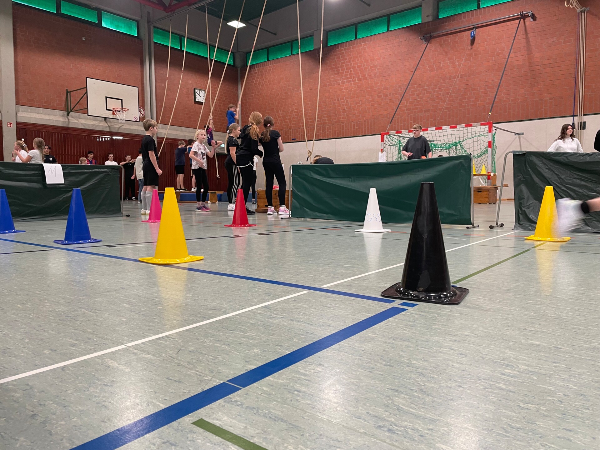 Sportlicher Teil der Veranstaltungen war ein buntes und aktives Rahmenprogramm. Ein Stationslauf mit rund 15 unterschiedlich gestalteten Bewegungsstationen setzte die theoretischen Inhalte der Zertifizierung in die praktische Erfahrung um. Etwa zehn Kinder absolvierten jeweils eine Station, bevor nach einigen Minuten ein Wechsel erfolgte. Die Aufgaben waren sehr vielfältig und reichten von klassischen Ballsportarten über Gleichgewichts- und Koordinationsübungen bis hin zu kurzen Schnelligkeitsparcours. Besonders die Jahrgänge 5 und 6, die aktiv teilnahmen, zeigten mit großer Begeisterung, wie viel Freude ihnen Bewegung macht.