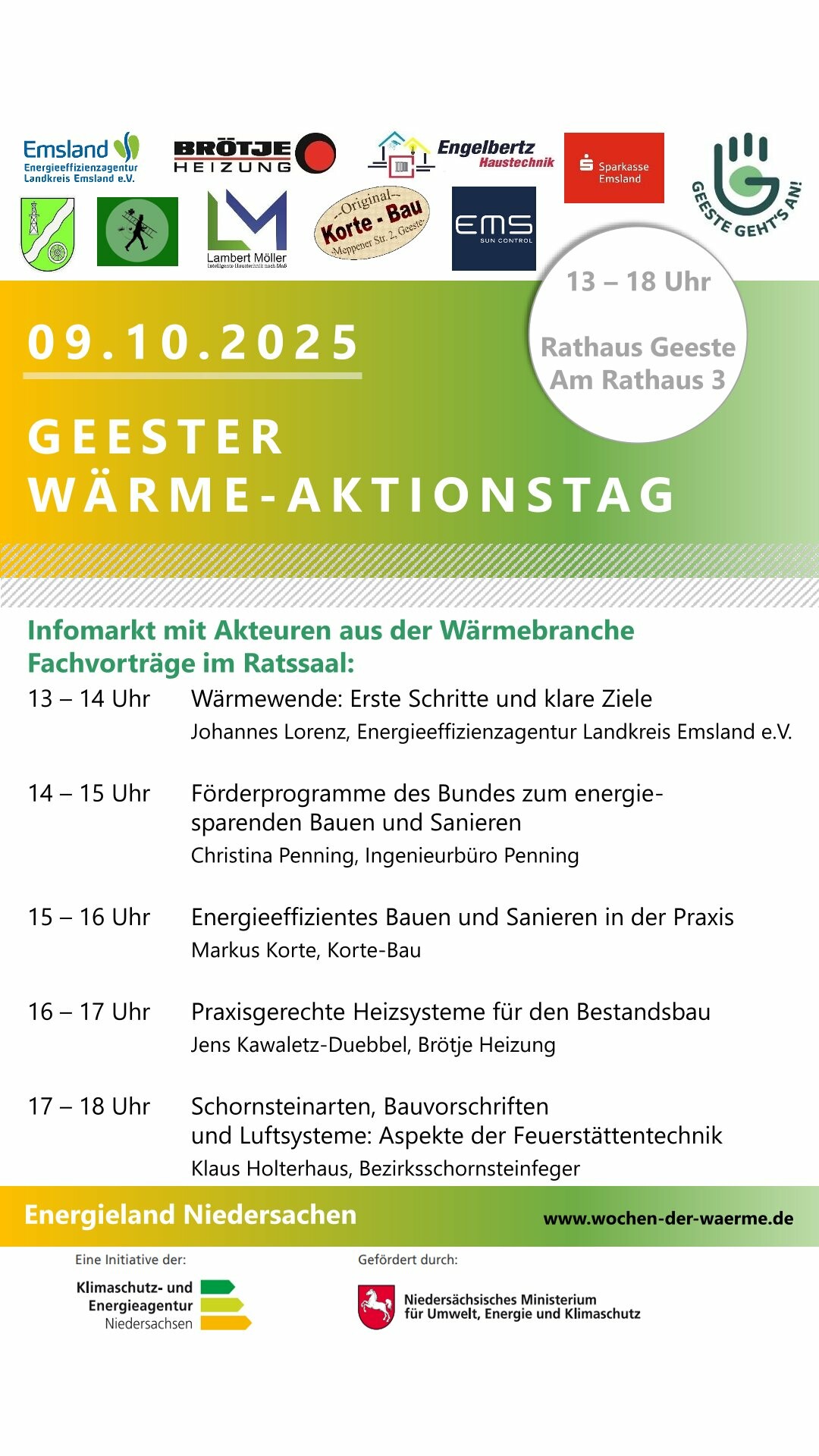 Auch die Gemeinde Geeste nimmt an dieser Aktion teil und lädt zum öffentlichen Wärme-Aktionstag am 09. Oktober 2025 von 13:00 Uhr bis 18:00 Uhr ins Rathaus ein.