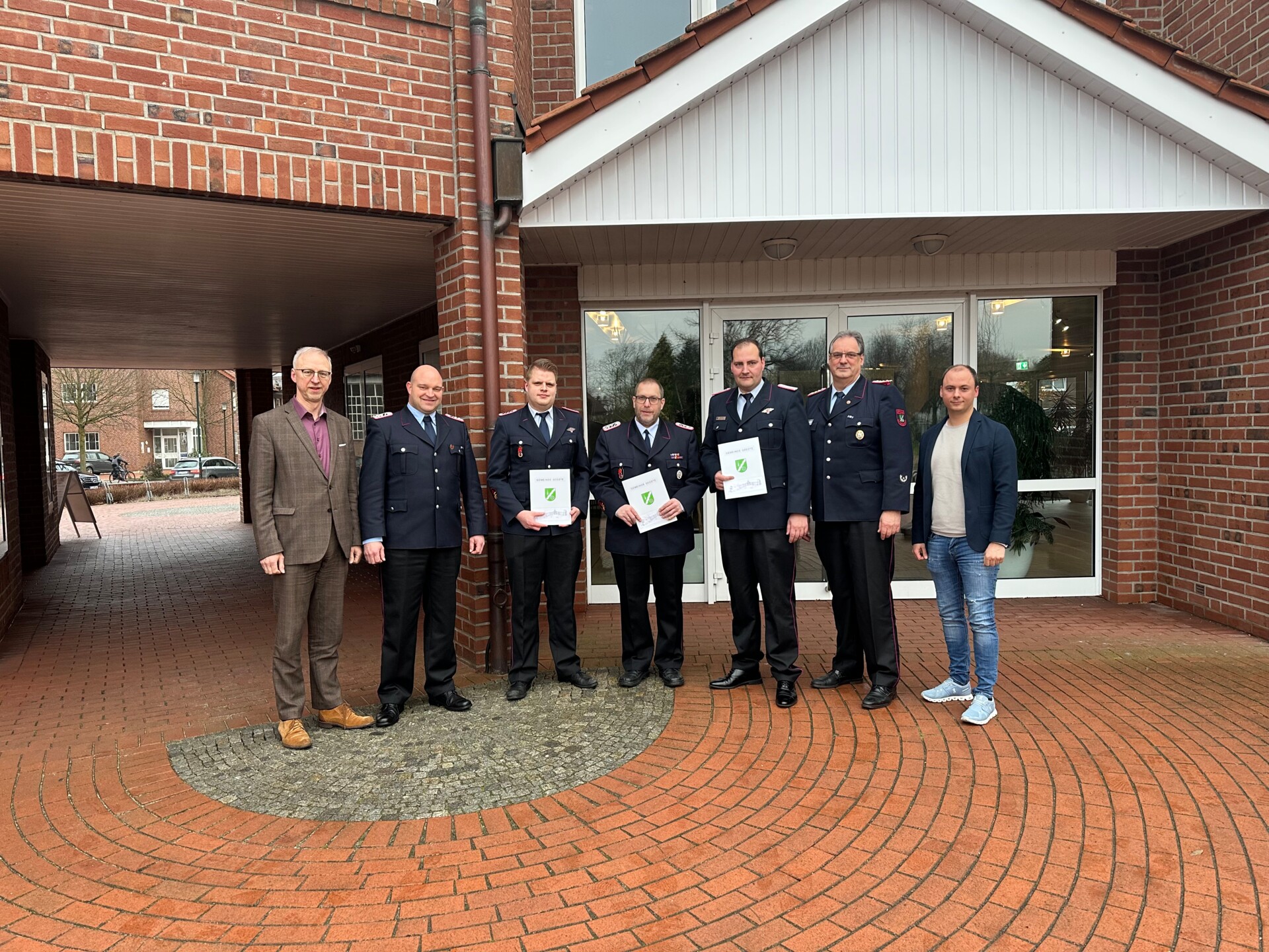 Foto: Gemeinde Geeste. Helmut Höke (1.v.l., Bürgermeister) und Fachbereichsleiter Oliver Franke (1.v.r.) ehren Mathis Thiemann (3.v.l.) und Carsten Timmer (4.v.l.) zur Fortsetzung ihrer Ämter als Gemeindejugendfeuerwehrwart und Stellvertreter. Ebenfalls gratulieren Karsten Snyders (2.v.l. stellvertretender Ortsbrandmeister Ortsfeuerwehr Osterbrock) sowie Daniel Wester (3.v.r. Ortsbrandmeister Ortsfeuerwehr Groß Hesepe) und Günter Keiser (2.v.l. Gemeindebrandmeister).