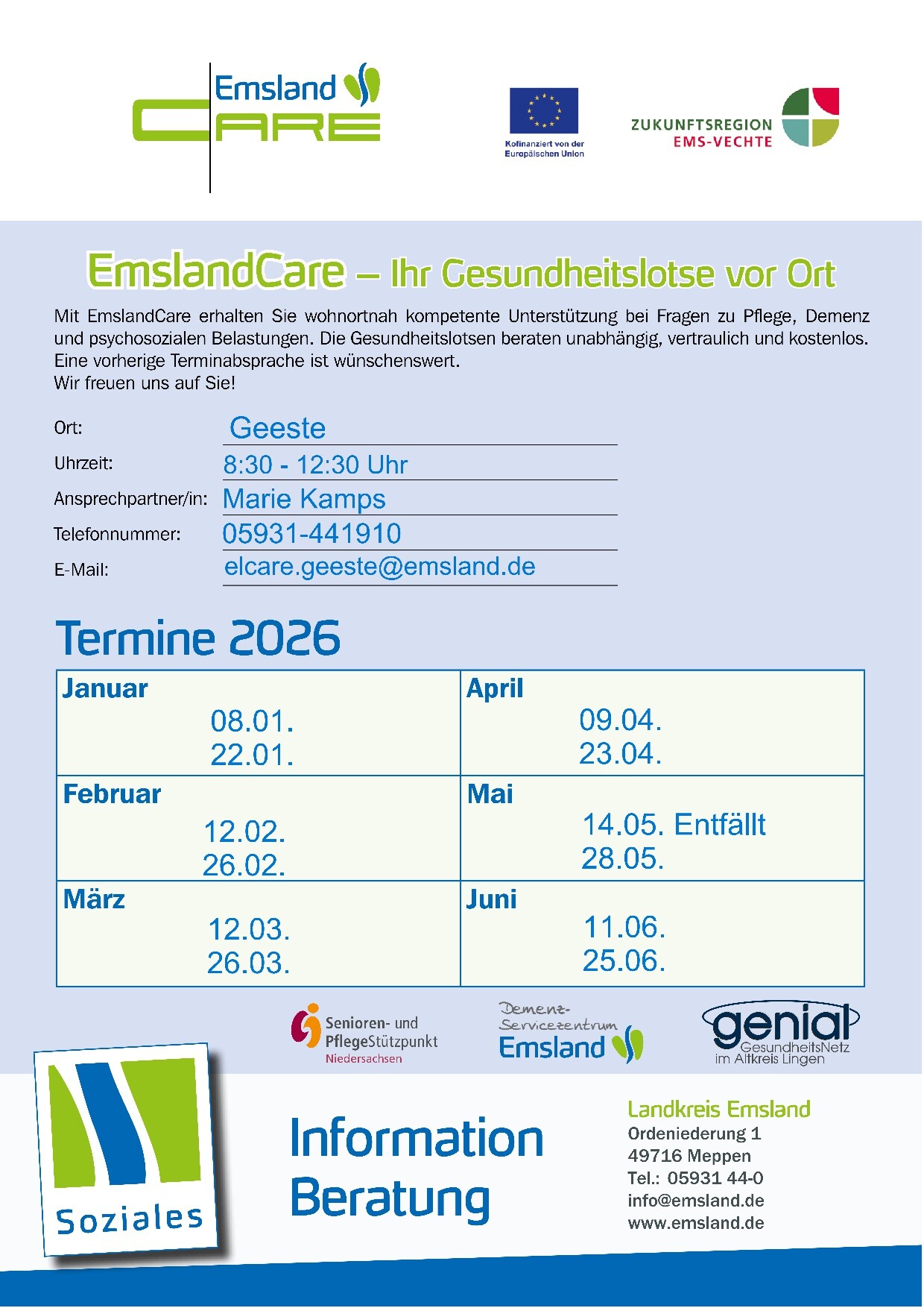 Mit dem auf Initiative der emsländischen Städte und Gemeinden entwickelten Projekt EmslandCare baut der Landkreis Emsland seine Unterstützungsangebote im Gesundheits- und Pflegebereich weiter aus. Hintergrund ist der gesellschaftliche Wandel: Steigender Zeitdruck, zunehmender Stress, komplexere Krankheitsbilder sowie nachlassende soziale Netzwerke betreffen immer häufiger auch jüngere und gesundheitlich belastete Menschen. In der Gemeinde Geeste steht den Bürgerinnen und Bürgern mit Gesundheitslotsin Marie Kamps ab sofort ein niedrigschwelliges Beratungs- und Unterstützungsangebot zur Seite.